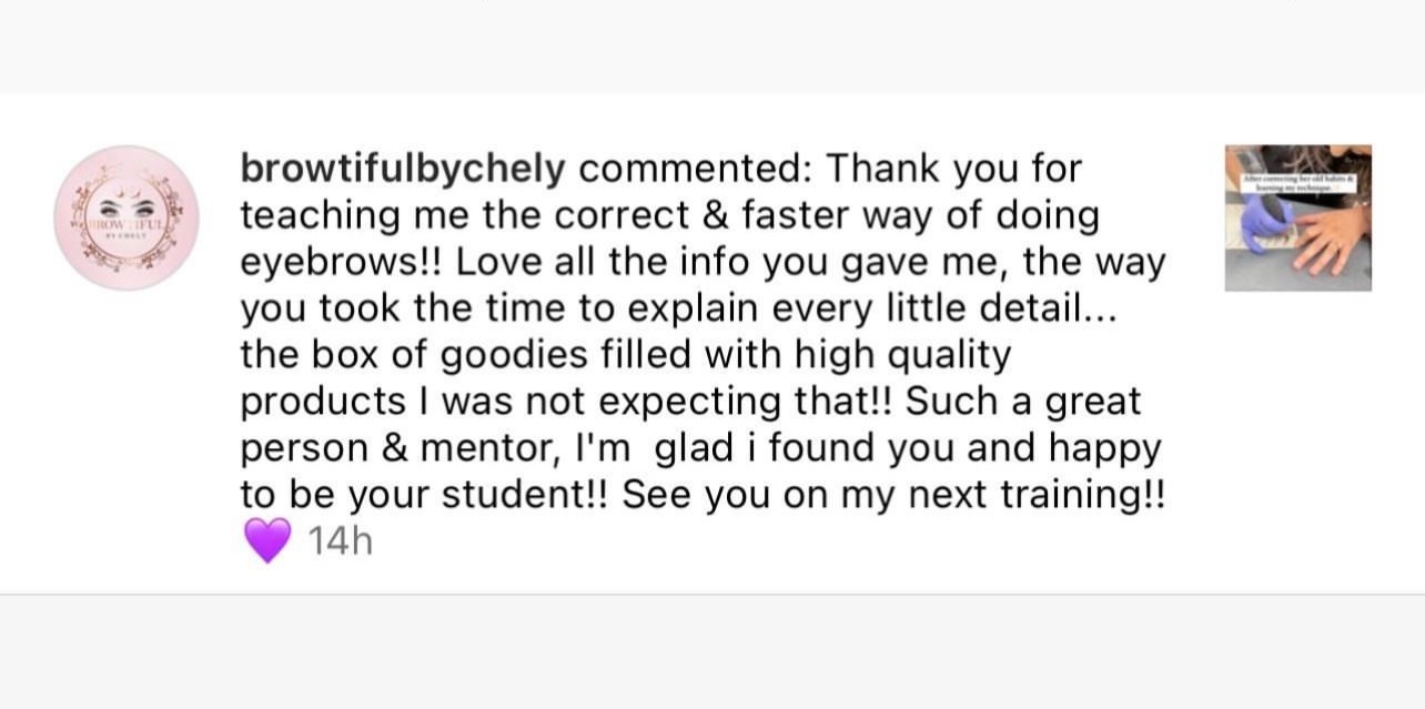 I have been perfecting the Art of Ombre Brows since 2017. With over 2000 procedures, teaching since 2019-- I have invested over $30k into trainings that I have taken myself. I recently opened up my own studio so I have knowledge when it comes to starting your own business and catering to a student’s needs. It has taken me years to develop and master my craft with everything in between. And with my training & mentorship, I am basically going to teach you a shortcut to it all! Doesn’t that sound awesome?!